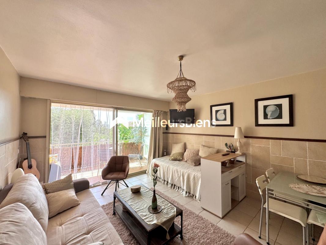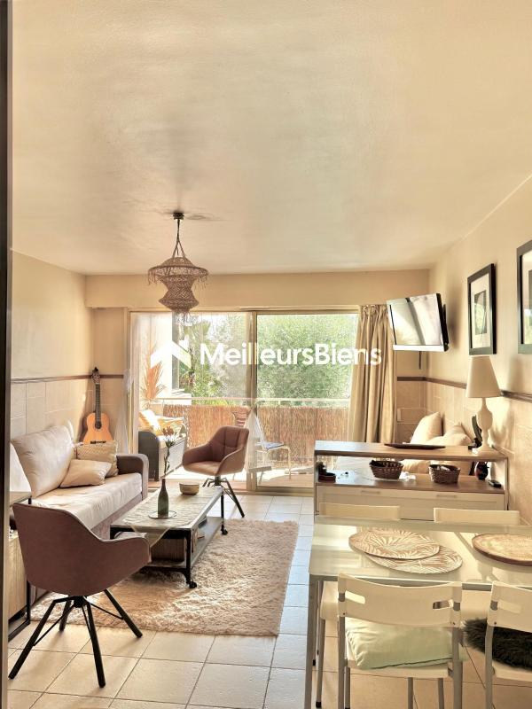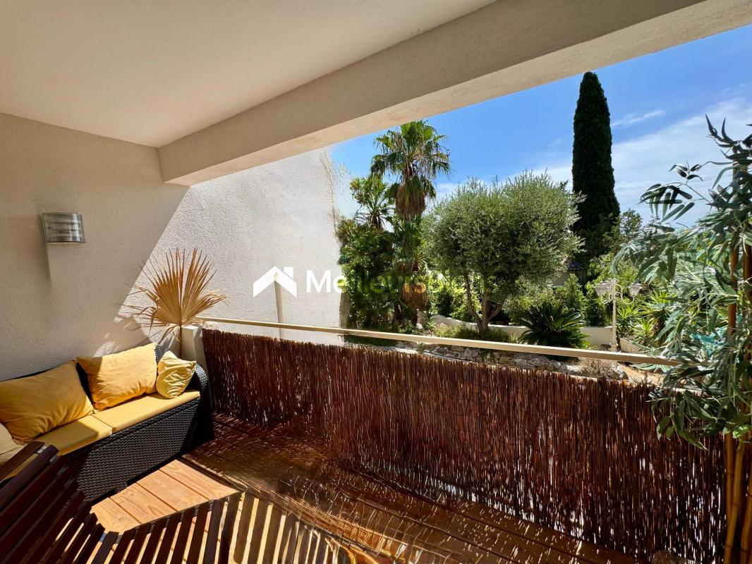 cet appartement de plus de 33m2 est très bien agencé : sa salle d'eau/bain a été rénovée, possède une fenêtre, son hall d'entrée avec placard sert de vestibule avec également un espace pour un lit superposé et un wc séparé. Le séjour donne sur la belle terrasse en teck de 8m2 par de grandes baies vitrées à double vitrage avec volets roulants électriques, la vue est très dégagée sur la végétation méditerranéenne avec un aperçu mer. Le coin cuisine est aménagé, et ouvert sur le séjour.