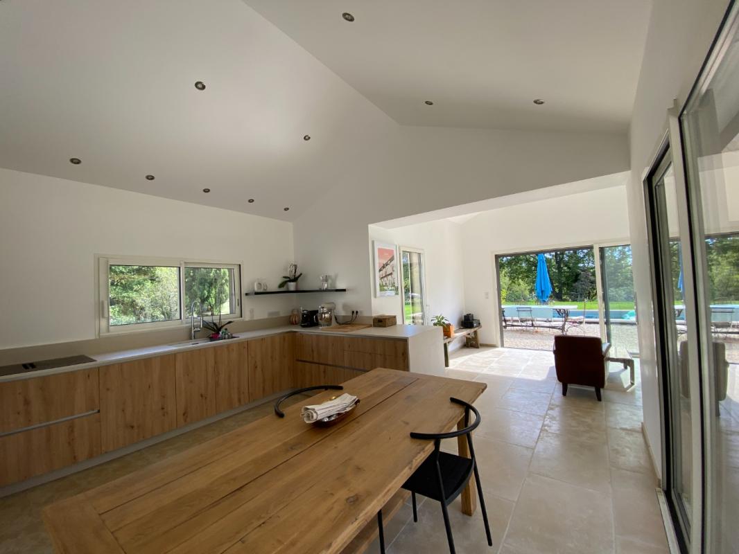 Sur un terrain de 2880 m² arboré avec une vue dégagée, se dresse cette demeure d'environ 100 m². L'espace se développe : une entrée, une belle pièce de vie baignée de lumière avec sa cuisine équipée, et dans son prolongement le salon ouvert sur la piscine entourée d'un jardin paysagé. Une première chambre avec sa salle d'eau, un wc, un bureau ouvert sur le jardin et dans son prolongement la suite parentale, spacieuse, lumineuse, avec une grande salle d'eau et un wc. La maison bénéficie de nombreux rangements, d'un poêle à bois performant, d'un forage neuf. Toutes les menuiseries alu sont bicolores (grises à l'extérieur, blanches à l'intérieur) et oscillo-battantes, la magnifique pierre de Montfort pour le sol, la cuisine est neuve et entièrement équipée, des volets roulants pour les baies vitrées. A l'extérieur, la nature est belle, des oliviers, des chênes, des arbres de Judée, lauriers, néfliers, pêchers, cerisiers... un arrosage automatique connecté pour le gazon, une piscine traditionnelle de 3.5 x 8 en PVC armé, et enfin un grand local technique de 18 m².