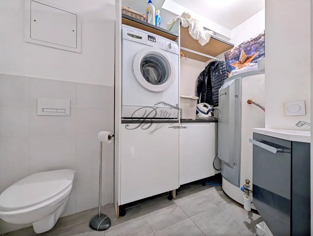 Une entrée avec placard desservant un toilette/buanderie, un beau séjour lumineux, une cuisine aménagée et équipée, et une terrasse d'environ 11 m².